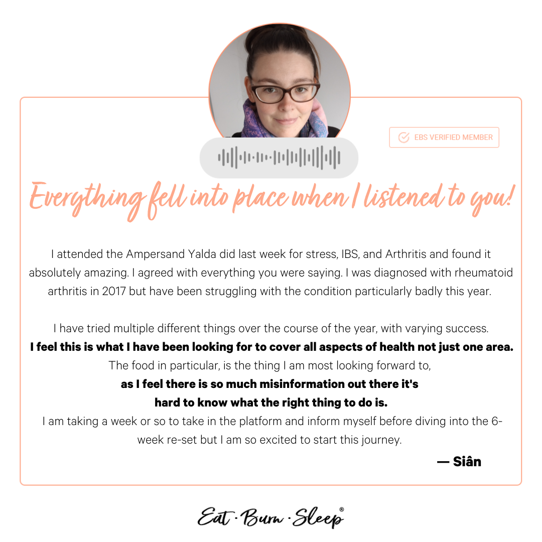 November 22nd Update from Siân:‘Thank you for another great webinar this evening. I feel so full of knowledge from your webinars and platform. How have I come so far in life without knowing these things? I have pasted my feedback below from the webinar this evening and added more detail. This year, I have had hospital appointments, physio, acupuncture, counseling, and medication – none of these treatments have come near the results I have seen by following the EBS lifestyle. I can’t believe the turnaround in my condition in such a short time. I had written 2022 off as the worst year and couldn’t wait to see the back of it. But the last few months have turned it into one of the best. I still have improvements to make, but I now have the tools to do it, so thank you.