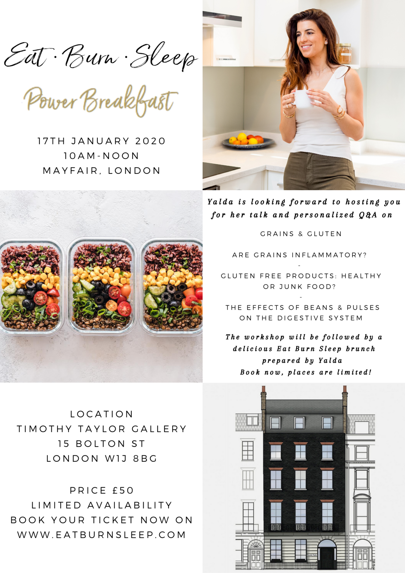 I am delighted to announce that the Eat Burn Sleep Power Breakfast is back on for the 17th of January 2020! This fantastic workshop will take place at the beautiful Timothy Taylor Gallery in Mayfair, London. I will give a talk covering the topic of grains, beans, pulses, corn and gluten in-depth, and how this topic links to inflammation, gut health and weight-loss. We will serve a delicious Eat Burn Sleep brunch featuring my most popular recipes, and you will also be given a very generous goodie bag filled with wonderful products!Find the details below. You do not need to print the confirmation email as we will have a list with your name on it. Feel free to bring friends or family members who might benefit from it. I’m excited to hold this event, and look forward to connecting with many of you.